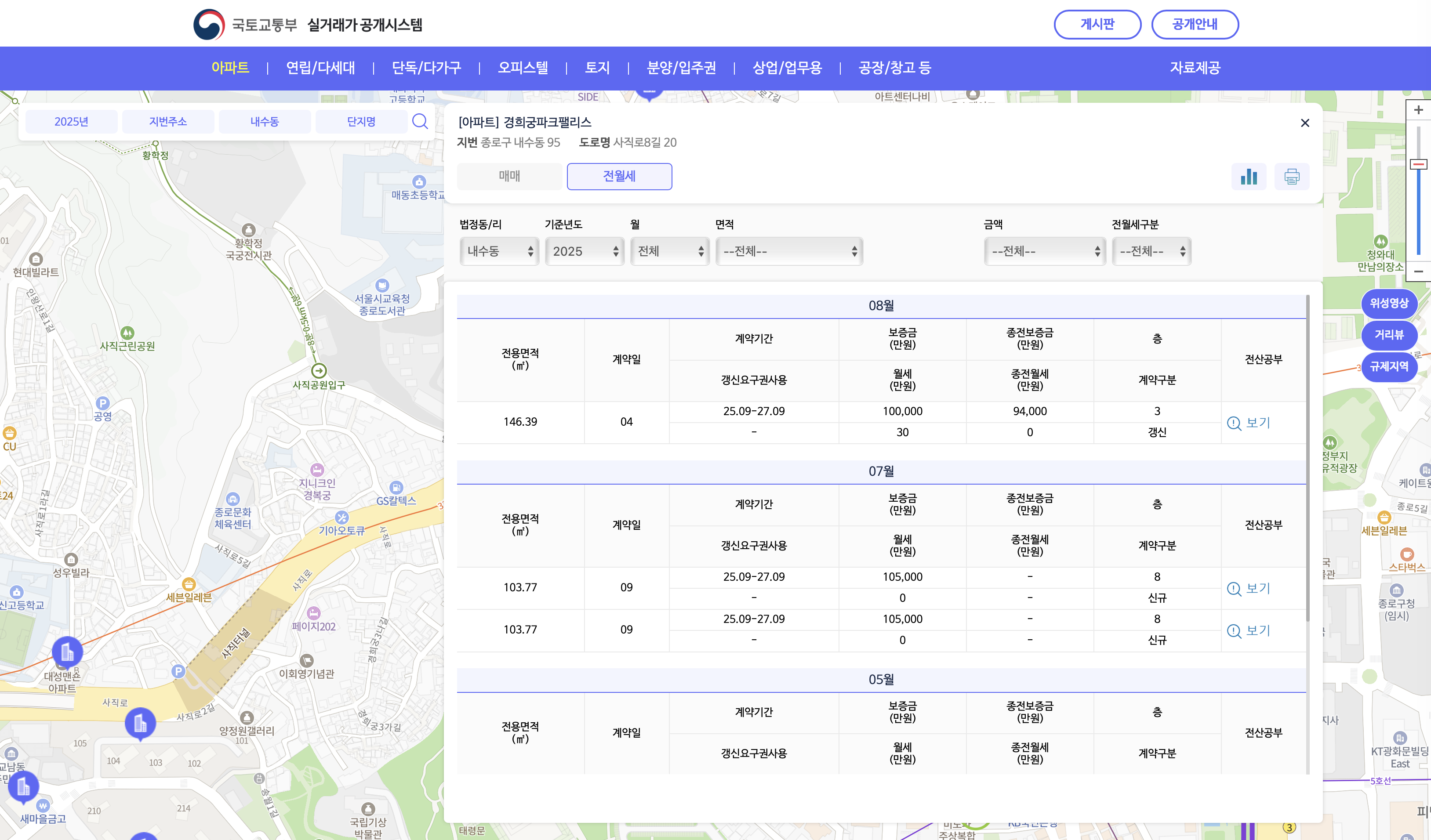 지역(시도 → 시군구 → 읍면동), 면적, 거래유형(매매, 전월세), 검색기간 등을 설정하면 원하는 범위의 거래 정보를 빠르게 찾을 수 있습니다. 예를 들어, 2025년 상반기 서울 송파구 잠실동 아파트 매매가를 보고 싶다면 조건을 지정해 조회하면 됩니다.