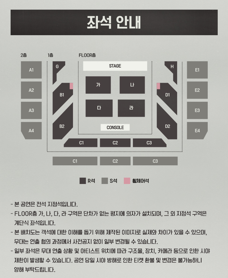 공연장별로 무대 방향, 음향 조건, 시야 확보 등 차이가 있으니 아래 사항을 참고하세요: