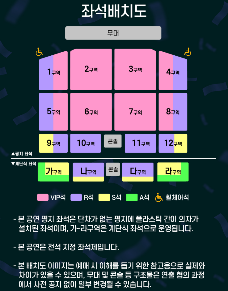 예매처 정책 및 공연장 구조에 따라 일부 구역은 별도의 좌석 등급이 존재할 수 있으며, 할인 쿠폰이나 카드사 제휴 혜택이 적용될 가능성도 있습니다.