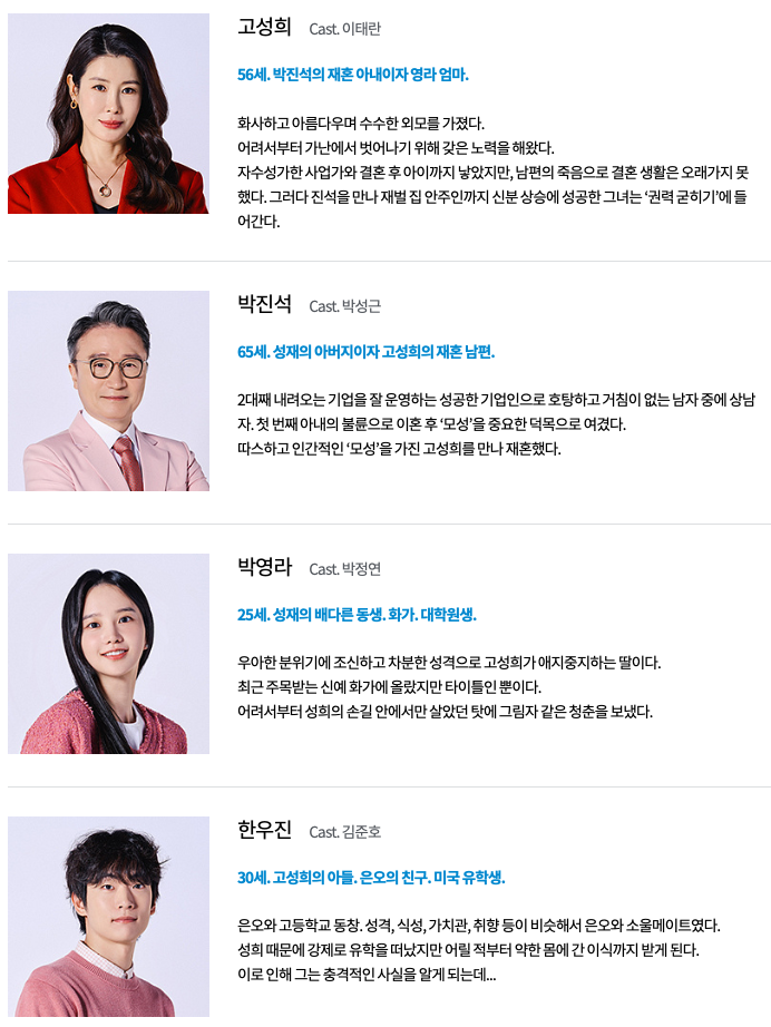 이 외에도 고원희, 천호진, 반효정, 이태란 등 세대별 명품 배우들이 다수 출연해 작품의 무게감을 더합니다.