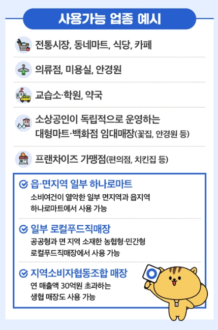 | 사용처 | 소상공인 가맹점, 전통시장, 일부 하나로마트, 지역생협 등 |